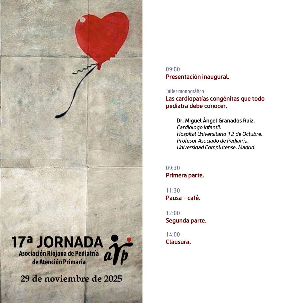 El sábado 29 de noviembre, un año más, se celebra nuestra Jornada (y van 17), con un novedoso formato de taller monográfico a cargo del Dr. Miguel Ángel Granados, experto cardiólogo pediátrico, que nos ilustrará sobre las cardiopatías congénitas que todo pediatra debe conocer. No os lo podéis perder. Os esperamos.